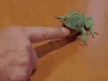 A person's finger gently touches a small green frog, which then surprisingly bites the finger.