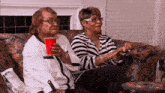 Aunt Bertha Beystheproblem gives an iconic side eye while holding a red cup on the couch.