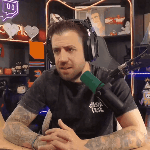 Auronplay reacts with a confused and skeptical expression while streaming, wearing headphones and a Santa Cruz shirt.