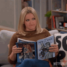 Emily Osment as Chelsea gives an awkward look while reading The New Yorker magazine on a couch.