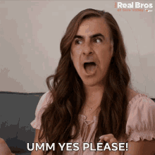 Alecpeters, with long hair and a pink top, enthusiastically exclaims 'Umm yes please!' in a humorous moment.