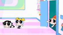Blossom, Bubbles, and Buttercup from The Powerpuff Girls are in a room, with Blossom calling for help.