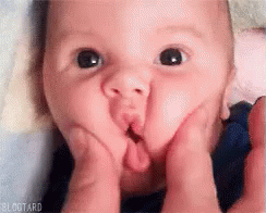 Adorable baby boy with chubby cheeks makes a funny O-shaped mouth as someone gently squeezes his face.