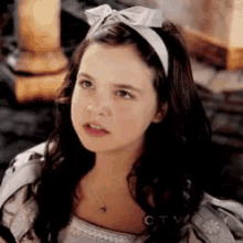 Bailee Madison, a young girl, looks confused and slightly concerned while wearing a white headband and dress.