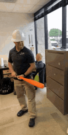 A man in a hard hat playfully swings an orange baseball bat in an indoor setting.