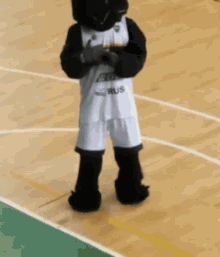 Panther mascot dances on a basketball court, wearing a jersey with 'RUS' on it.