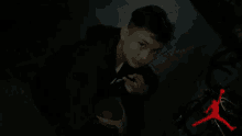 Marco Elizeo Jose poses in a dark setting, looking at the camera with a red Air Jordan logo visible in the background.