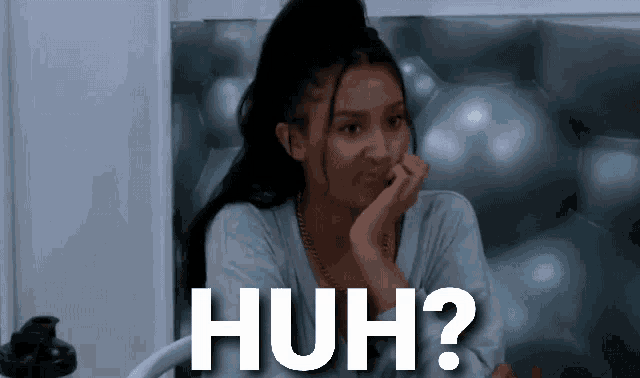 Hannah from Big Brother 23 (Bb23) looks confused with 'HUH?' text, reacting to something unexpected.