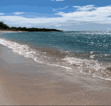 Waves gently crash on a sandy beach under a bright, sunny sky with distant trees.