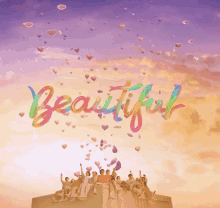 K-pop group TREASURE under a sky of falling hearts, with the word 'Beautiful' prominently displayed.