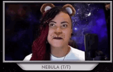 Bee_zelda, wearing a lion mask, makes a 'sus' expression in front of a microphone.