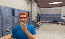 Vicente Rocha, a character in a blue shirt and red glasses, blows a kiss in a locker room.