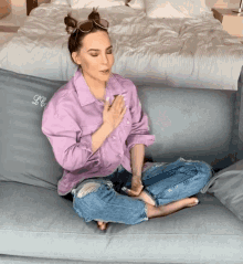 Beli Belindapop waves from a gray couch, wearing a purple shirt and ripped jeans with her hair in buns.