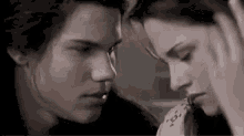 Bella and Jacob share a tender, close moment, their faces nearly touching in an intimate scene.