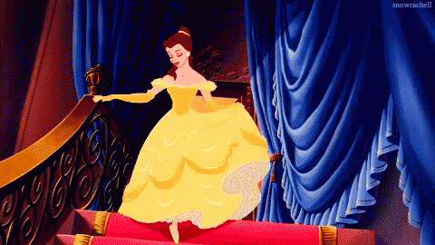 Belle from Beauty and the Beast gracefully descends a grand staircase in her iconic yellow ball gown.