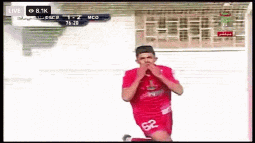 Belloumi celebrates a goal for MCO, wearing number 32, during an Algerian football match.