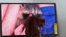 A Bengal cat playfully interacts with a raccoon shown on a television screen, pawing at the image.