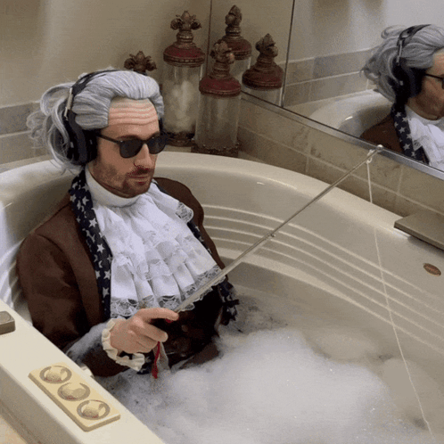 Benjammins, dressed in a historical wig and sunglasses, enjoys a bubble bath while 'fishing' with a rod.