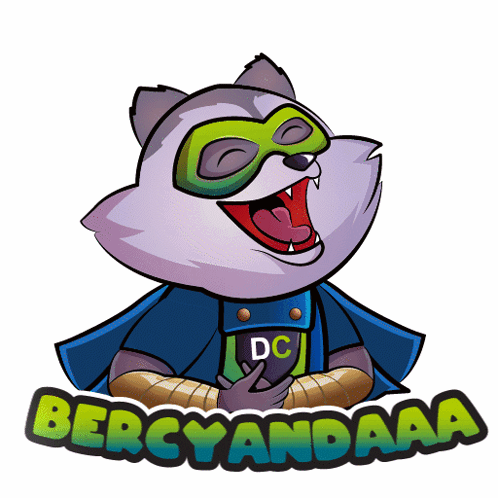 A funny cartoon raccoon superhero in a mask and cape laughs heartily, with 'BERCYANDAAA' text below.