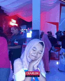 A girl in a pink hijab makes a cute sleeping pose at a Djarum Badminton Club event, wishing everyone a goodnight.
