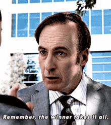 Bob Odenkirk as Jimmy McGill/Saul Goodman delivers the memorable line: 'Remember, the winner takes it all.'