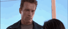 Arnold Schwarzenegger as the Terminator attempts an awkward smile while looking at someone.