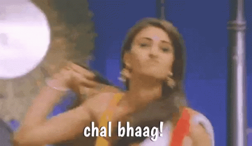 A woman with long hair and a bindi sternly says 'chal bhaag!' (go away!) with an angry expression.