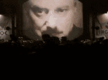 A massive face, reminiscent of Big Brother, is projected onto a screen, looming over a dark, silent crowd.