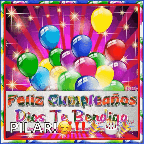 Colorful birthday card with balloons and the message 'Happy Birthday God Bless You PILAR!'