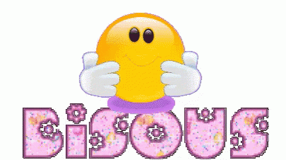 Animated smiley face blowing kisses with small hearts and the word 'Bisous' in glittery text.