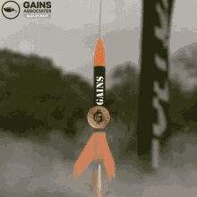 A rocket branded with 'GAINS' and a Bitcoin-like coin launches, symbolizing growth in blockchain and crypto.