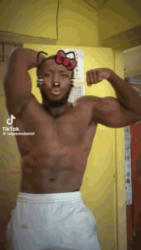 A shirtless man with a beard dances and flexes while wearing a fun Hello Kitty face filter.