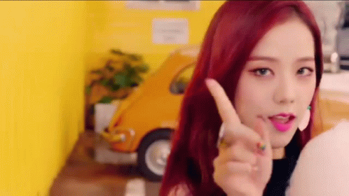 Blackpink's Jisoo performs a finger heart gesture and points, showcasing her charm in a vibrant K-pop music video.