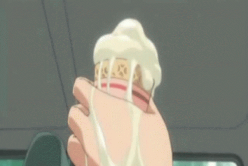 A hand holds a melting ice cream cone, with cream dripping down, from Bocu No Pico.