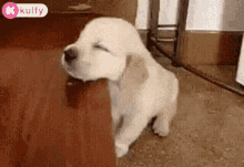 An adorable puppy struggles to stay awake, resting its head on a wooden surface and slowly drifting off to sleep.