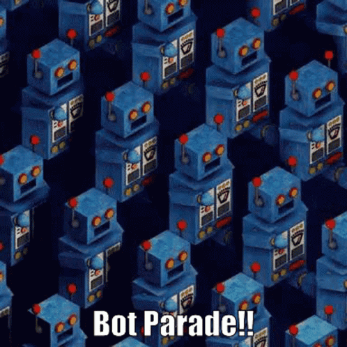 A mesmerizing parade of blue, blocky robots with red eyes, marching in a seamless pattern.
