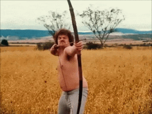 A man with a curly wig and a bow and arrow runs and shoots in a golden field.