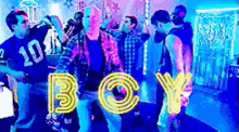 Group of men dancing at a vibrant party, illuminated by neon lights spelling 'BOY' and 'DANCE PARTY'.