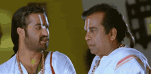 Brahmi and Jr NTR in a scene from the movie Adhurs, both wearing traditional attire and engaged in conversation.