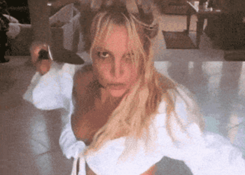 Britney Spears, with blonde hair and a white top, holds two knives in a dramatic pose.