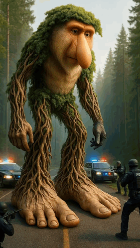 Giant tree monster with a proboscis monkey face confronts police in a forest, part of the Brr Brr Patapim brainrot meme.