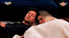 Bernardo Tomas and Bruna Gomes share a cozy moment under a blanket on Big Brother, displayed on a TV screen.