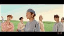 V from BTS puts on sunglasses in the 'Dynamite' music video, with other members in a vibrant field.