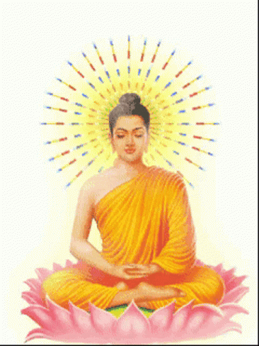A serene illustration of Lord Buddha meditating peacefully on a pink lotus flower with a glowing halo.