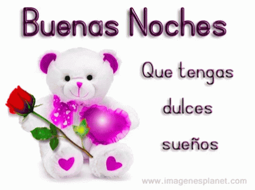 A cute white teddy bear holds a red rose and a purple heart, wishing 'Good Night, Have sweet dreams' in Spanish.