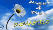 A beautiful white daisy against a vibrant blue sky with clouds, wishing someone a Happy Name Day.