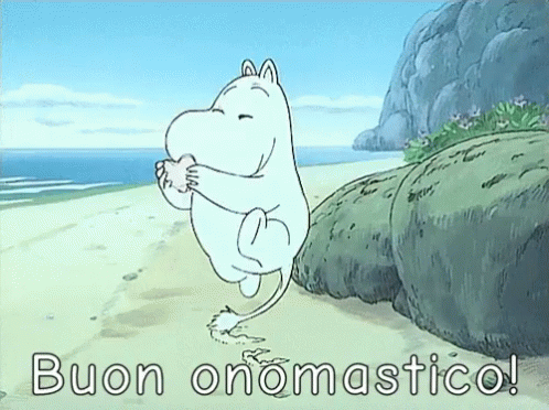 A Moomin-like cartoon character celebrates 'Buon Onomastico!' (Happy Name Day!) on a sunny beach.