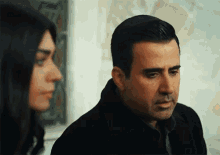 Burcu Kıratlı and Emrah share an intense moment, looking at each other with serious expressions.