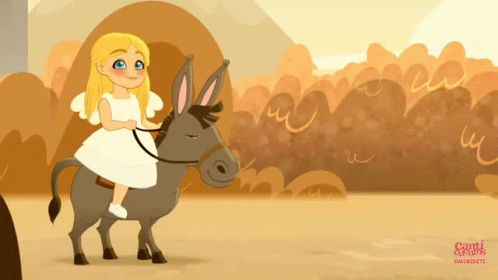 A cheerful cartoon girl with blonde hair and wings rides a friendly burro donkey through a warm landscape.