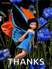 An animated butterfly fairy in a blue dress with wings flies through a field of blue and orange flowers, saying thanks.